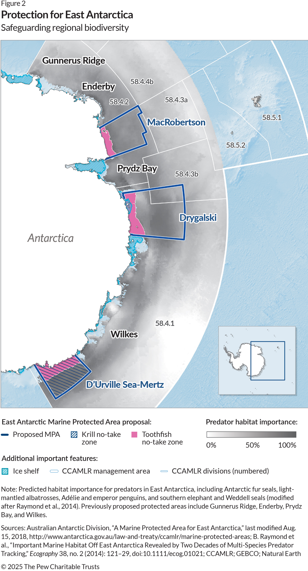 - Australian Antarctic Division, “A Marine Protected Area for East Antarctica,” last modified Aug. 15, 2018, http://www.antarctica.gov.au/law-and-treaty/ccamlr/marine-protected-areas; B. Raymond et al., “Important Marine Habitat Off East Antarctica Revealed by Two Decades of Multi-Species Predator Tracking,” Ecography 38, no. 2 (2014): 121–29, doi:10.1111/ecog.01021.