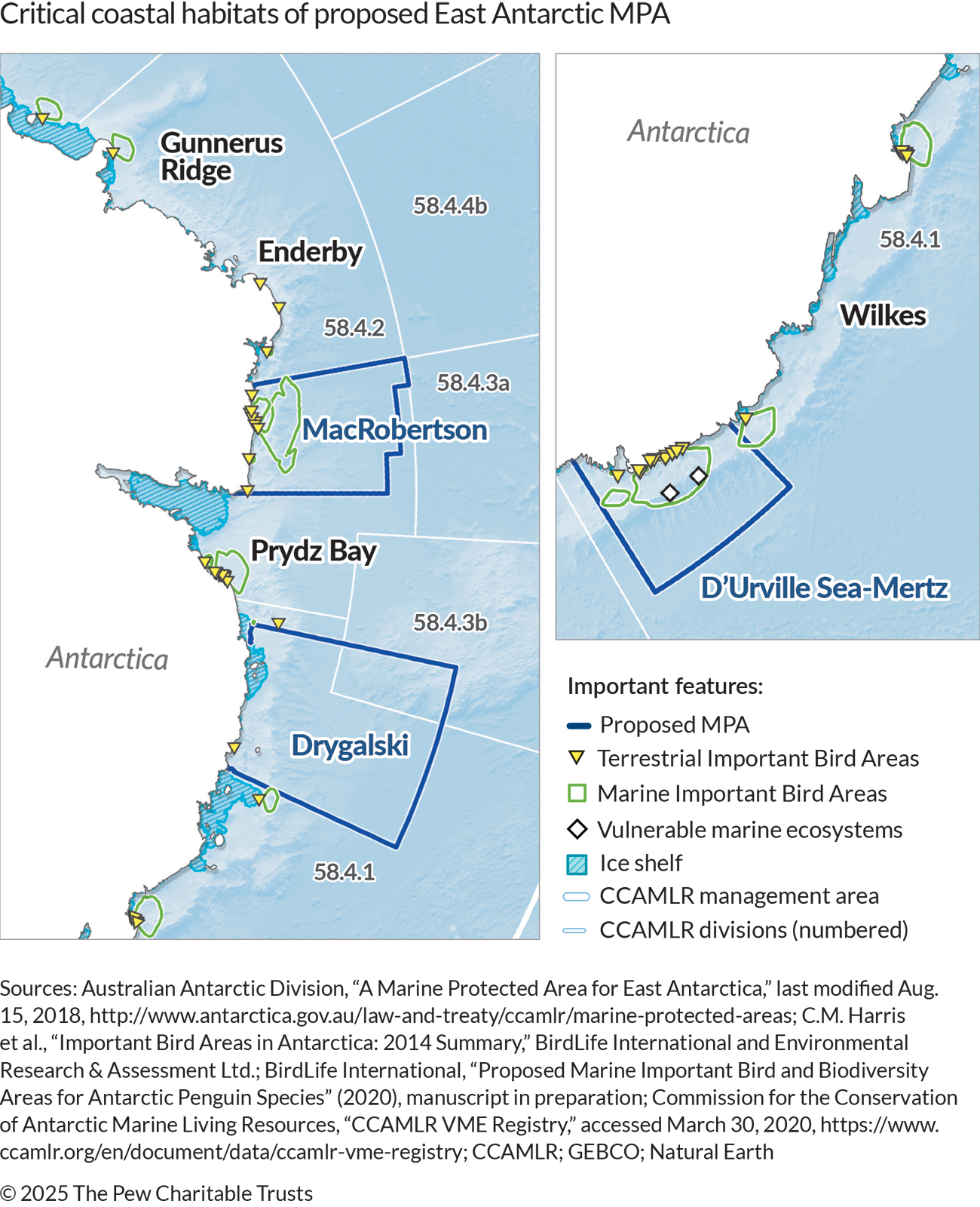 - C.M. Harris et al., “Important Bird Areas in Antarctica: 2014 Summary,” BirdLife International and Environmental Research & Assessment Ltd.; BirdLife International, “Proposed Marine Important Bird and Biodiversity Areas for Antarctic Penguin Species” (2020), manuscript in preparation; Commission for the Conservation of Antarctic Marine Living Resources, “CCAMLR VME Registry,” accessed March 30, 2020, https://www.ccamlr.org/en/document/data/ccamlr-vme-registry.