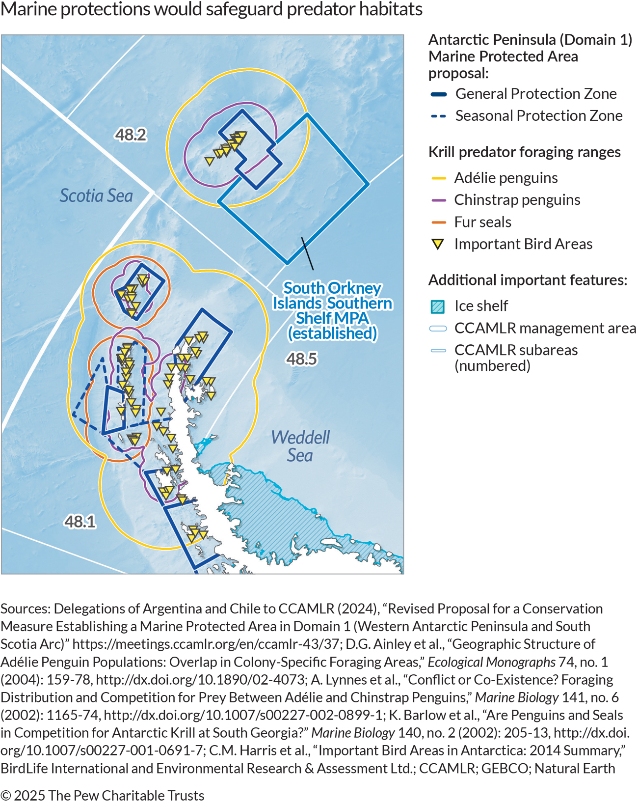 - D.G. Ainley et al., “Geographic Structure of Adélie Penguin Populations: Overlap in Colony-Specific Foraging Areas,” Ecological Monographs 74, no. 1 (2004): 159-178, http://dx.doi.org/10.1890/02-4073; A. Lynnes et al., “Conflict or Co-Existence? Foraging Distribution and Competition for Prey Between Adélie and Chinstrap Penguins,” Marine Biology 141, no. 6 (2002): 1165-74, http://dx.doi.org/10.1007/s00227-002-0899-1; K. Barlow et al., “Are Penguins and Seals in Competition for Antarctic Krill at South Georgia?” Marine Biology 140, no. 2 (2002): 205-13, http://dx.doi.org/10.1007/s00227-001-0691-7; C.M. Harris et al., “Important Bird Areas in Antarctica: 2014 Summary,” BirdLife International and Environmental Research & Assessment Ltd.; L. Krüger, “Spatio-Temporal Trends of the Krill Fisheries in the Western Antarctic Peninsula and Southern Scotia Arc,” Fisheries Management and Ecology 26, no. 4 (2019): 1-7, https://doi.org/10.1111/fme.12363.