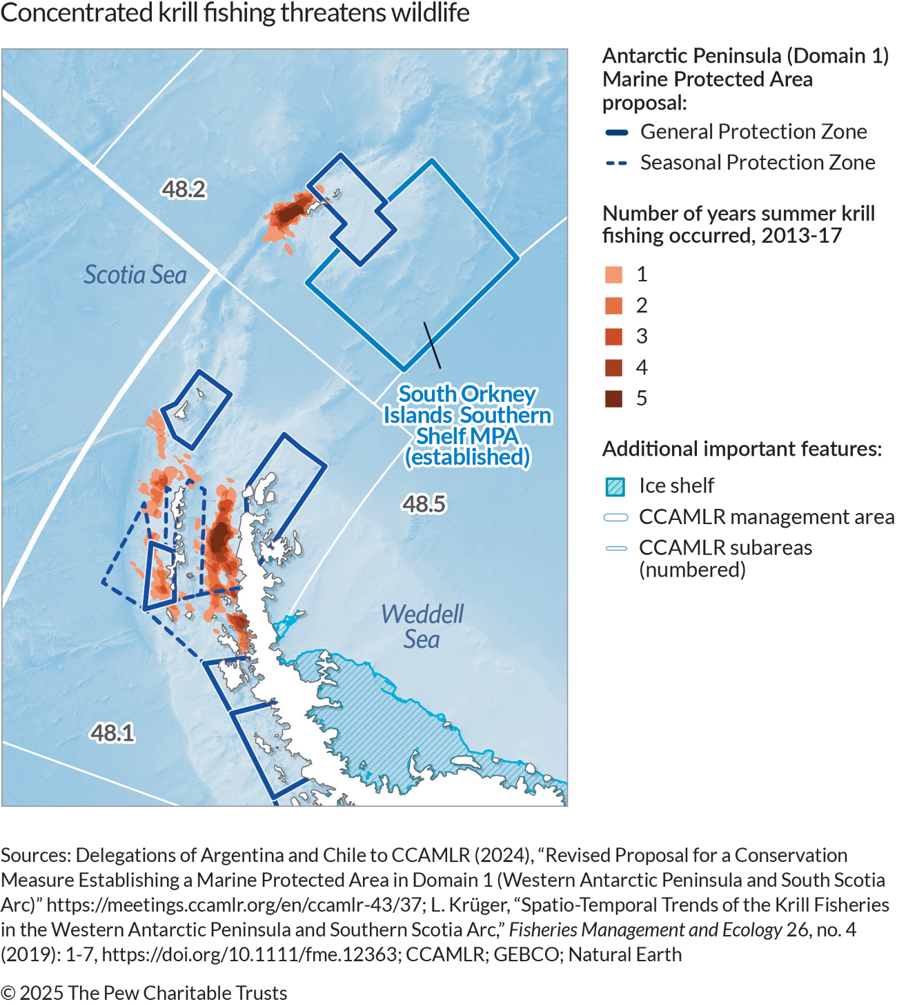 The Antarctic Peninsula (Domain 1) Marine Protected Area proposal includes a General Protection Zone27 that covers two biologically rich areas—the Bransfield and Gerlache Straits—and would prohibit krill fishing in the coastal foraging ranges of Antarctic predators. It also protects a part of the Bellingshausen Sea that is an important spawning and nursery area for krill, and other ecologically significant areas for commercially valuable fish species. The Krill Fishing Zone would allow for commercial krill fishing for member nations, managed under CCAMLR’s conservation measures. CCAMLR is working to advance ecosystem-based fisheries management to ensure the long-term survival of the fishery and protect the numerous species that depend on Antarctic krill.