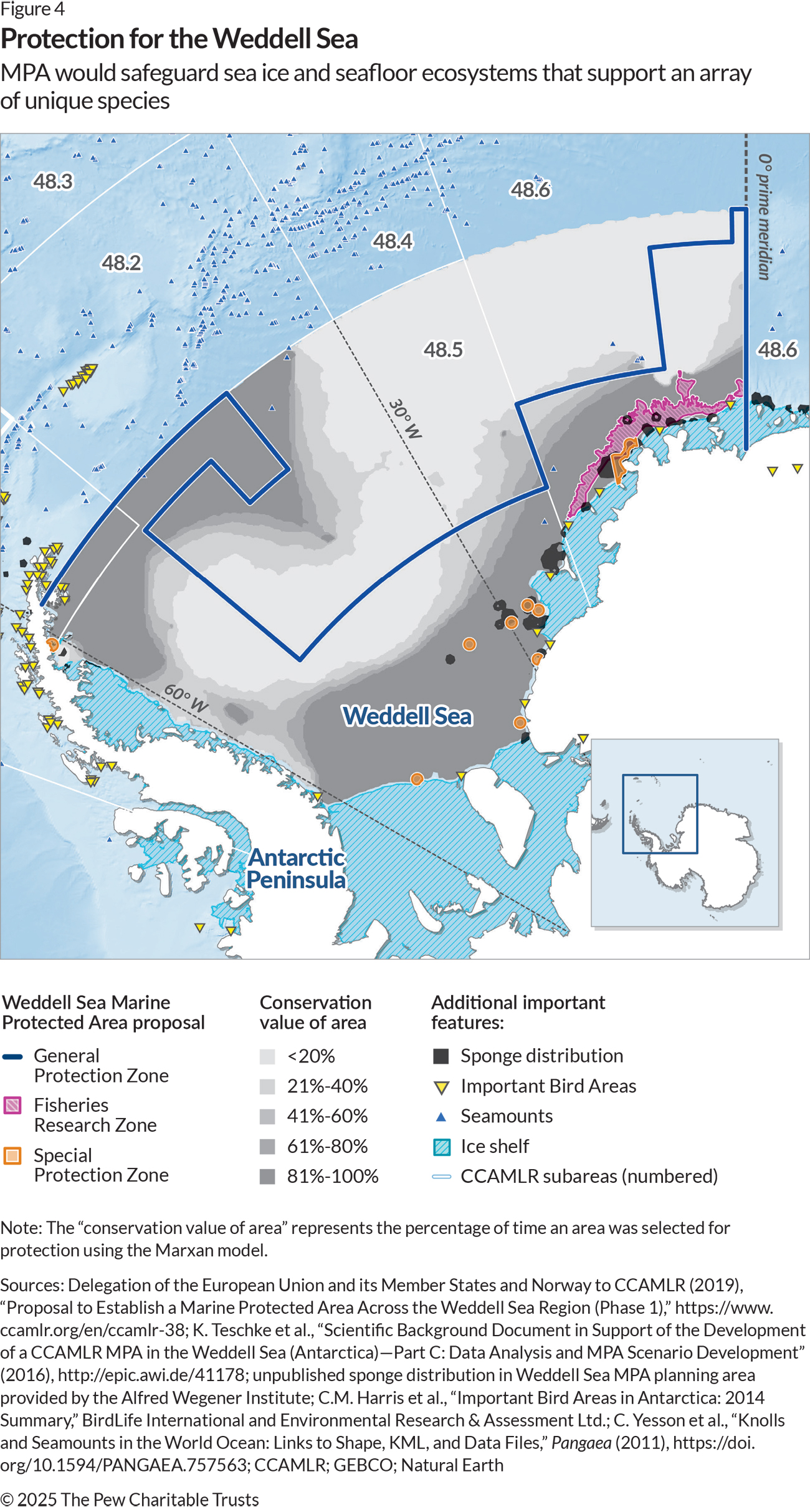- Delegation of the European Union and its Member States and Norway to CCAMLR (2019), “Proposal to Establish a Marine Protected Area Across the Weddell Sea Region (Phase 1),” https://www.ccamlr.org/en/ccamlr-38; K. Teschke et al., “Scientific Background Document in Support of the Development of a CCAMLR MPA in the Weddell Sea (Antarctica)—Part C: Data Analysis and MPA Scenario Development” (2016), http://epic.awi.de/41178; unpublished sponge distribution in Weddell Sea MPA planning area provided by the Alfred Wegener Institute; C.M. Harris et al., “Important Bird Areas in Antarctica: 2014 Summary,” BirdLife International and Environmental Research & Assessment Ltd.; C. Yesson et al., “Knolls and Seamounts in the World Ocean: Links to Shape, KML, and Data Files,” Pangaea (2011), https://doi.org/10.1594/PANGAEA.757563.